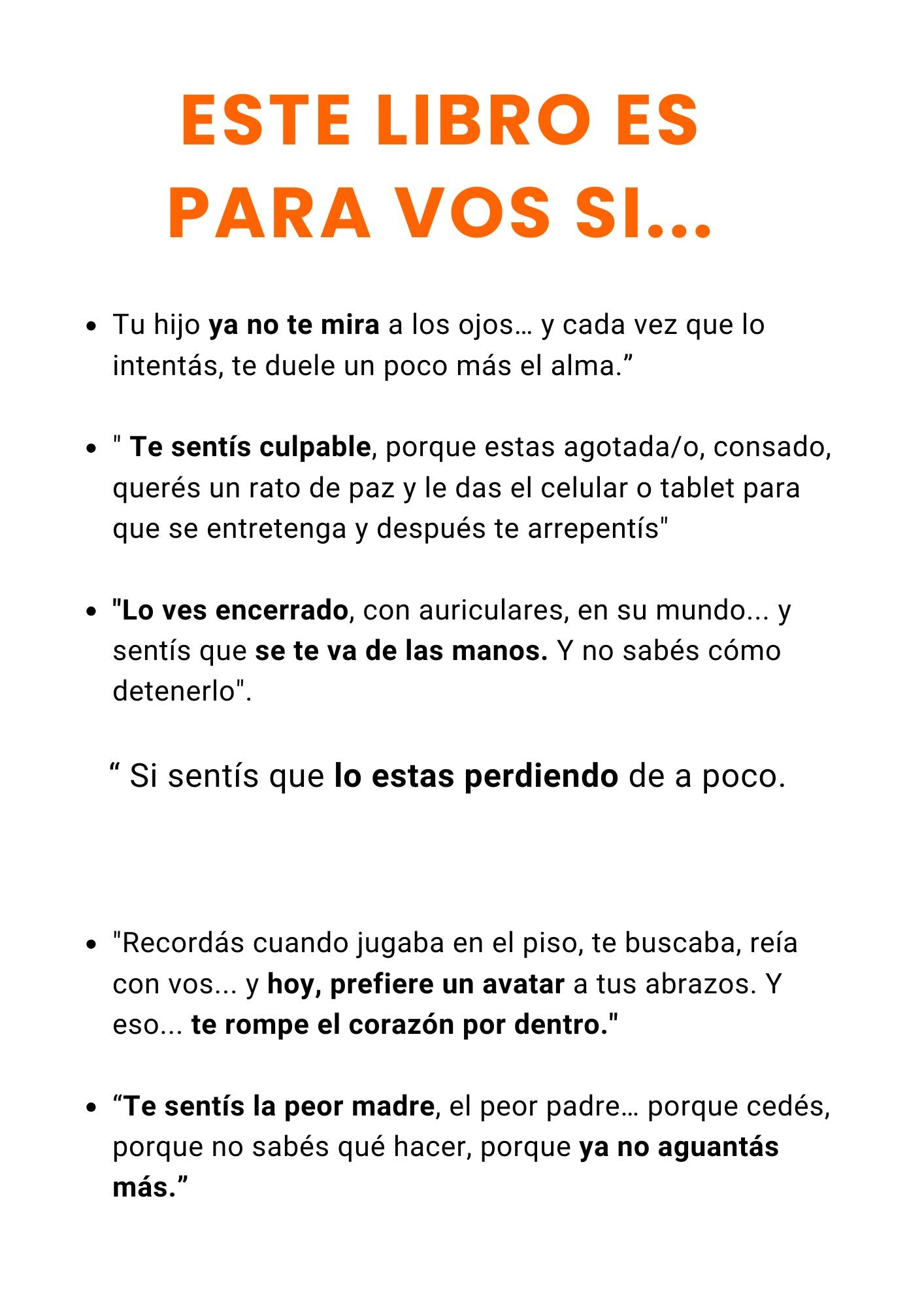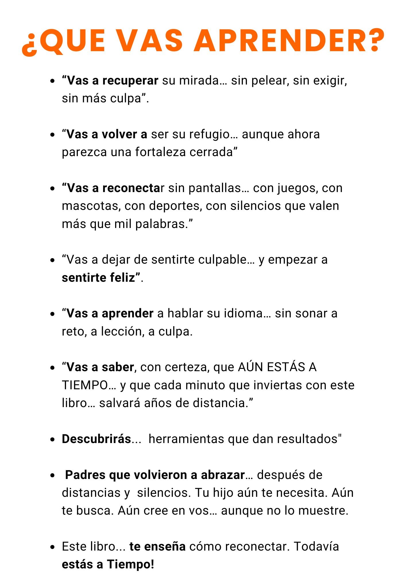 Sí . Porque las pantallas no destruyen el vínculo… lo enmascaran. Y bajo esa máscara, tu hijo/a todavía te necesita. Este libro te ayuda a reconectar sin presión, te brinda herramientas y a recuperar momentos de presencia que parecían imposibles.
